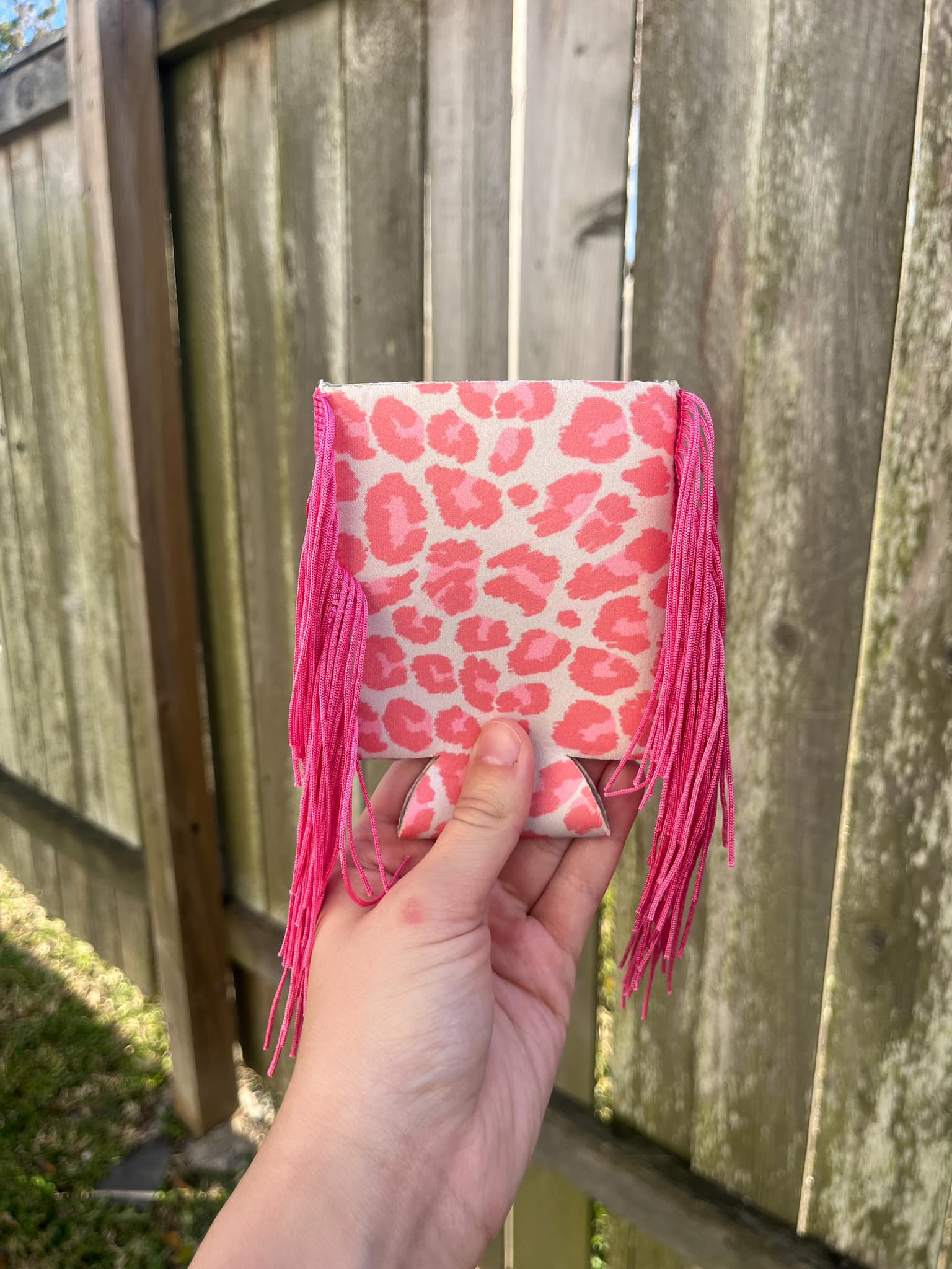 Elevate your drink game with this chic pink leopard koozie. Soft fringe details and a bold pattern make it a must-have accessory for any stylish outing.